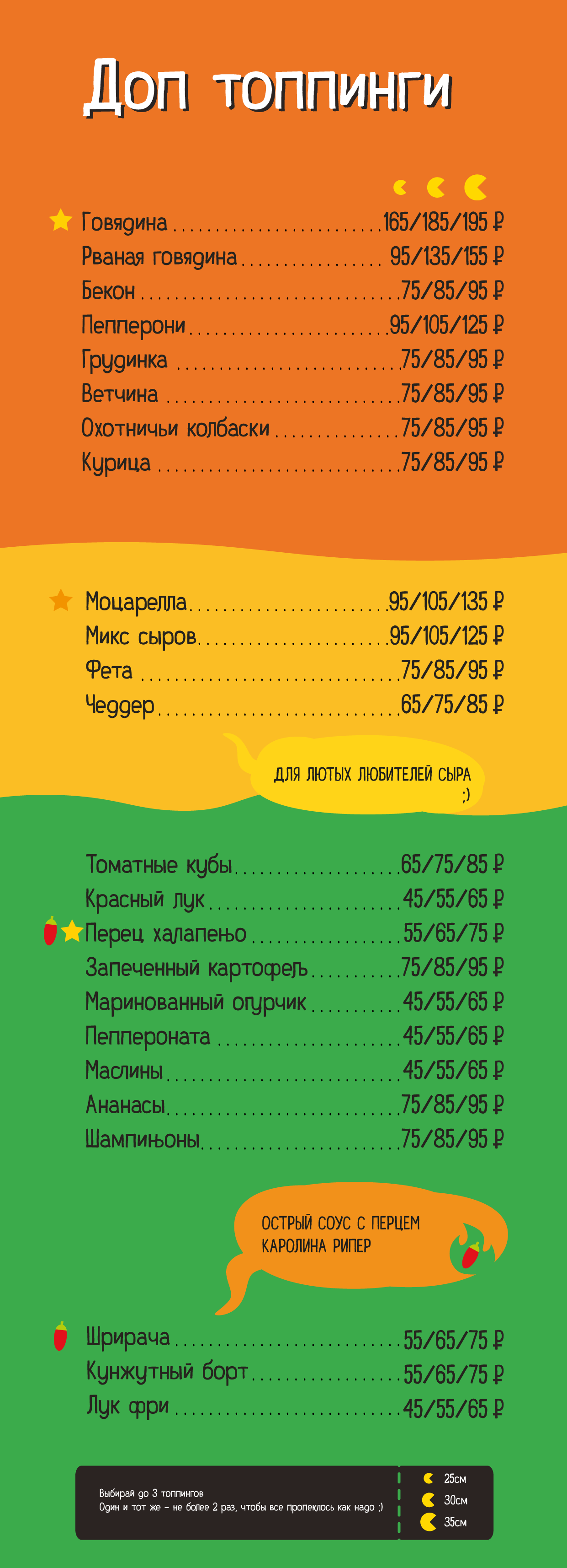 P. p. s. Мы технически не можем добавить более трех топпингов в одну пиццу, а также не более двух повторяющихся (например, сделаем: говядина/моцарелла/лук; ананасы/ананасы/перец и тд; не сделаем: лук/лук/лук, говядина/огурчики/моцарелла/томаты и тд)